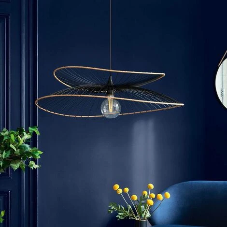 Découvrez cette très moderne suspension en métal et rotin Alara noir à l’allure très chic de grande dimension avec ses 69,5 cm de diamètre. Ce bel éclairage de plafond filaire en fer et rotin sera du plus bel effet avec une belle ampoule (non fournie) et s’intégrera parfaitement dans bon nombre d’intérieurs aux influences contemporaines.