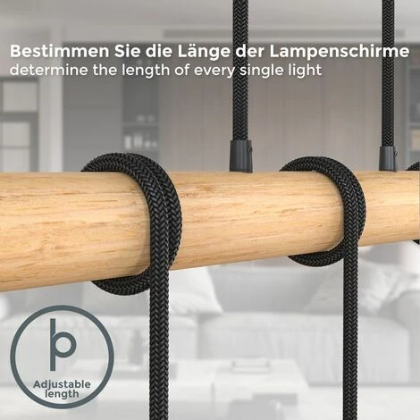 Individuel : Avec cette lampe suspendue en bois à 5 flammes, vous êtes extrêmement flexible. Les câbles textiles vous permettent d’enrouler les sources lumineuses individuellement. Ainsi, la hauteur de chaque lampe peut être ajustée selon les besoins.