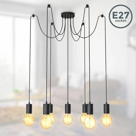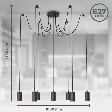 Fonction : suspension pour 7 ampoules au total: une ampoule au centre entourée par 6 ampoules. La longueur du câble de 2 mètres au total peut être ajustée individuellement à l’aide des fixations de câble incluses.