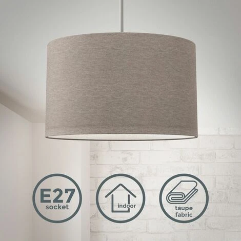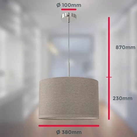 - ECLAIRAGE – cette suspension avec son abat-jour en textile de couleur taupe est équipée d’une douille E27 pour ampoule LED ou halogène de max. 40 Watt. Nous recommandons des ampoules LED beaucoup plus économiques.