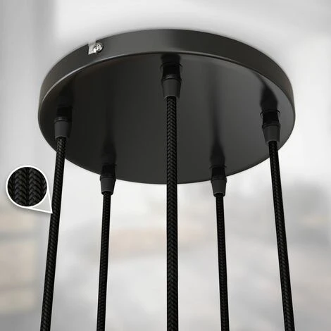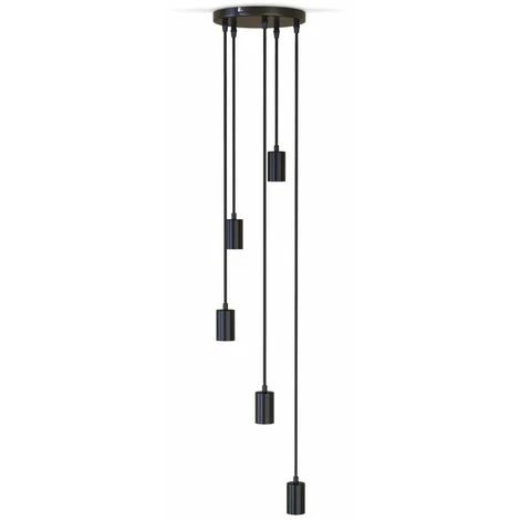 DIMENSIONS : le plafonnier mesure 210mm en diamĂštre pour une hauteur totale de 1200mm. La plaque de fixation est dâun diamĂštre de 210mm, les trous de fixation sont Ă une distance de 180mm. Les 5 cĂąbles Ă douille ont une longueur comprise entre 550 et 1200 mm et ne sont pas rĂ©glables en hauteur.