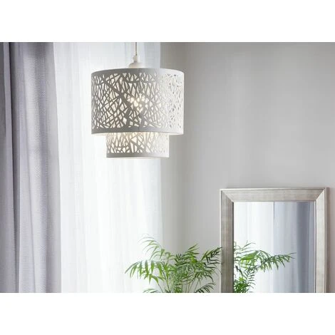 Lampe suspension blanche au style moderne. Ce plafonnier élégant embellit n’importe quel type de décor en passant du glam au minimaliste. Fabriqué à partir de métal durable et robuste blanc, cette pièce comporte un double abat-jour en tambour conçu pour ressembler à un lustre. La lampe éclaire la pièce avec une lumière agréable et rayonnante et projette une ombre distinctive sur les murs grâce à un motif en bande unique et très élégant.