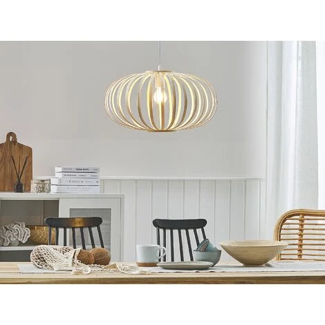 Lampe suspension design en bambou clair naturel. Apportez un peu de nature dans votre intérieur avec ce luminaire suspension en bambou. Son abat jour en forme de cage ovale laisse passer une lumière douce et chaude qui permet de créer une ambiance chaleureuse dans n’importe qu’elle pièce de votre maison. Cette lampe suspension est idéale pour une décoration au style boho ou moderne, aussi bien dans votre salon, cuisine que salle à manger.