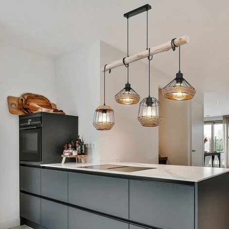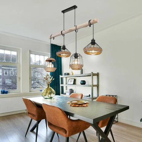 La lampe à suspension de 105 cm de long se compose d’un bâton en bois enveloppé de quatre câbles noirs et suspendu au plafond. Les câbles sont fournis avec quatre écrans en treillis métallique noir, que vous pouvez équiper des lampes E27 de votre choix. Cela vous donne la possibilité de déterminer individuellement la couleur et la luminosité de la lumière.