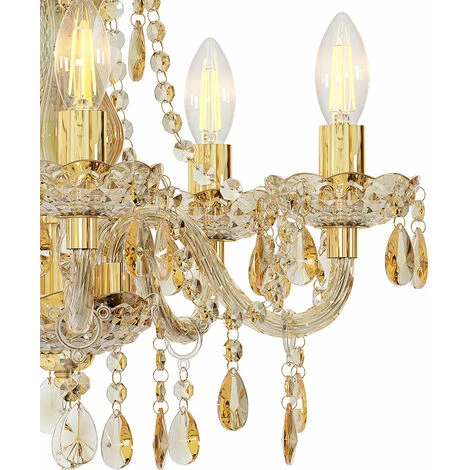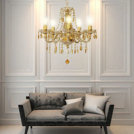 la description Ce lustre de 5″ de couleur dorée élégante est définitivement un accroche-regard qui donne à votre maison un accent glamour. Grâce également au rideau en acrylique, qui est simplement attaché au dessous du lustre, cela peut être mis en valeur. Les ampoules en forme de bougie conviennent mieux aux cinq douilles E14. Que ce soit dans votre entrée, dans le salon ou dans la chambre, ce lustre d’un diamètre de 48 cm et d’une hauteur de 45 cm ne manquera pas d’impressionner. Les ampoules ne sont pas comprises dans la livraison. Lampe de détail • Type de lampe : lustre • Matériau du cadre : métal, verre acrylique