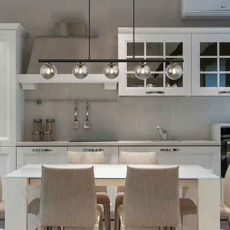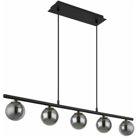 la description Cette grande lampe suspendue inspire par son beau design. Cinq magnifiques abat-jour en verre fumé (Ø9cm) sont fixés à une tige en métal noir mat de 90cm de long qui est suspendue à un plafonnier rectangulaire par deux câbles jusqu’à 1,2m. Les douilles G9 vous permettent de décider vous-même de la couleur et de l’intensité de la lumière jusqu’à une puissance maximale de 25 watts. Les ampoules ne sont pas comprises dans la livraison. Lampe de détail • Type de lampe : plafonnier