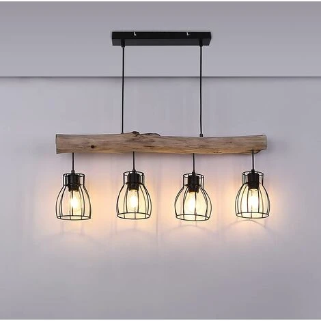la description Il s’agit d’une lampe suspendue extravagante et élégante en métal noir qui fait bonne figure dans presque toutes les pièces. Il y a quatre douilles E27 sur une poutre en bois suspendue, qui sont entourées d’un abat-jour rond en forme de treillis. En choisissant librement la source lumineuse (4 x E27 / max. 40W), vous pouvez déterminer vous-même l’intensité lumineuse et la couleur de la lumière de cette lampe d’intérieur. En raison de leur longévité, nous recommandons les lampes LED. Vous pouvez utiliser d’autres modèles de cette série pour améliorer encore l’apparence de votre espace de vie. Les ampoules ne sont pas comprises dans la livraison ! Détails lampe • Type de lampe : suspension