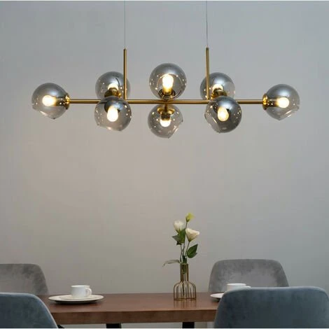 Grande suspension moderne et tendance Carlotta, faite de métal couleur laiton et de sphères en verre fumé. Ajoutez-la à votre pièce pour éclairer au-dessus d’une table ou au centre d’une pièce à vivre. Elle mesure 110 cm de long et sa hauteur peut-être réglée. Complétée de 8 ampoules E27, elle illumine de manière homogène toute la surface à éclairer. L’association du laiton et des sphères en verre fumé fait de ce luminaire un objet décoratif pour accueillir une décoration moderne. Descriptif technique du luminaire : Culot de l’ampoule : E27 | Ampoule : 40W | Indice de protection : IP20 | Tension : 220/230V 50/60Hz | Poids du luminaire : 5 kg | Poids du colis : 6 kg | Couleur du produit : Doré / Laiton | Matière : Métal et verre | Longueur : 110 cm | Largeur : 35 cm | Hauteur : 31 cm | Diamètre : | Profondeur :