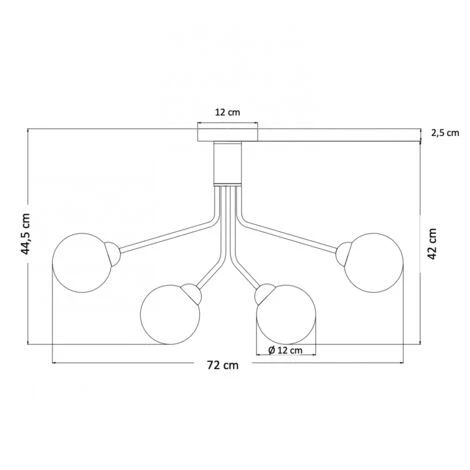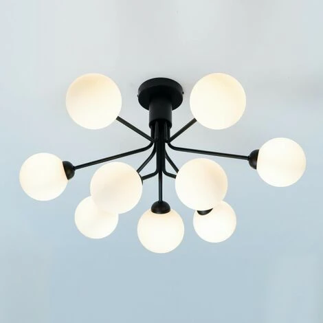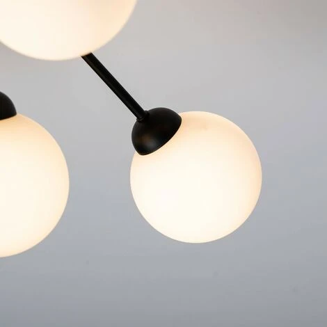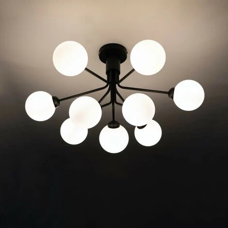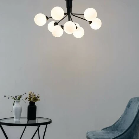 Succombez au charme du plafonnier Audrey et ses multiples sphères en verre. Son design aux multiples branches de métal noirs et ses abat-jours de verre donnent tout son charme à ce luminaire. Il convient particulièrement à une décoration moderne. Son diamètre au total fait 70 cm. Il fonctionne grâce à 9 petites ampoules culot G9 max 5W qui diffusent un bel éclairage dans toute la pièce. Plus qu’un luminaire, c’est un réel objet décoratif qui reste admirable même éteint. Descriptif technique du luminaire : Culot de l’ampoule : G9 | Ampoule : 9 x max 5W | Indice de protection : IP20 | Tension : 220/230V 50/60Hz | Poids du luminaire : 3 kg | Poids du colis : 4 kg | Couleur du produit : Noir et blanc | Matière : Métal et verre | Longueur : | Largeur : | Hauteur : 42 cm | Diamètre : 72 cm | Profondeur :