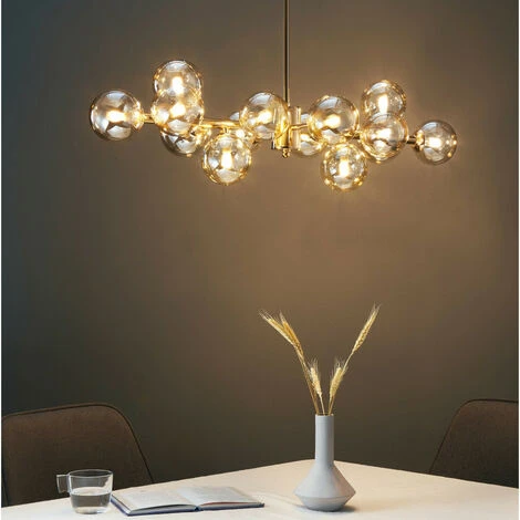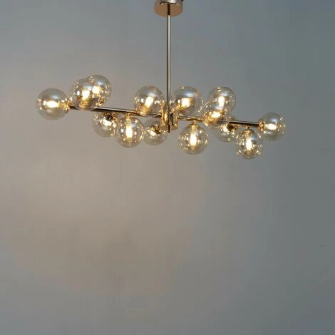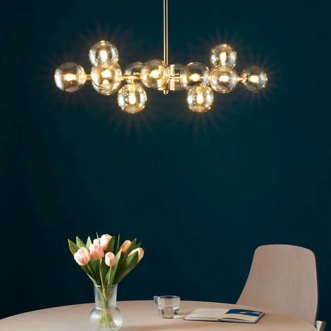 Ossana est une superbe suspension dorée dimmable de 86 cm de longueur ! Complétez chacune des 17 sphères en verre d’une ampoule de culot G9 max 28 W. Pour un éclairage économique mais éclatant nous vous conseillons des ampoules LED. Idéal dans une grande pièce, le mariage de l’inox doré et des sphères en verre fumé ne laissera ces observateurs sans voix ! Descriptif technique du luminaire : Culot de l’ampoule : G9 | Ampoule : 14 x max 28W | Indice de protection : IP20 | Tension : 220/230V 50/60Hz | Poids du luminaire : 2,5 kg | Poids du colis : 3,6 kg | Couleur du produit : Doré / Laiton | Matière : Verre et inox | Longueur : 86 cm | Largeur : 42 cm | Hauteur : 54 cm | Diamètre : | Profondeur :