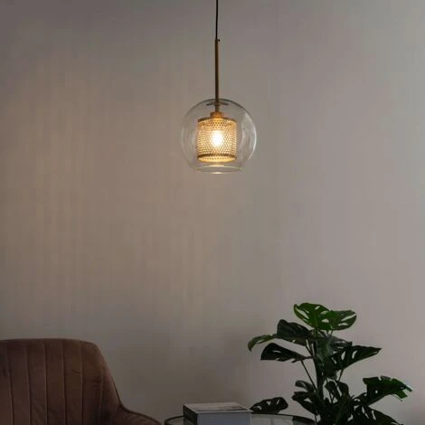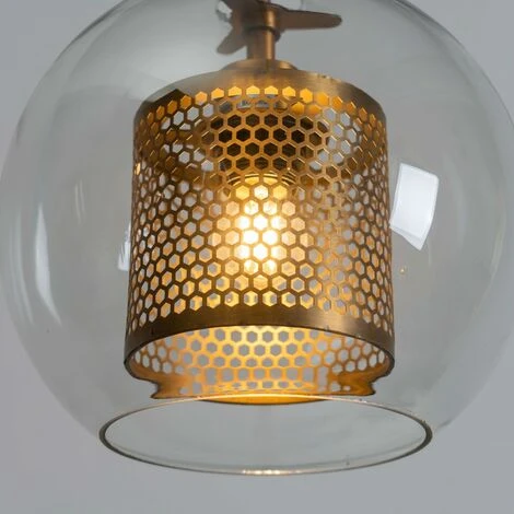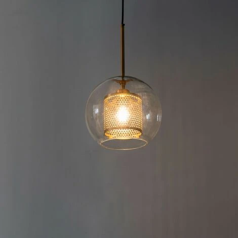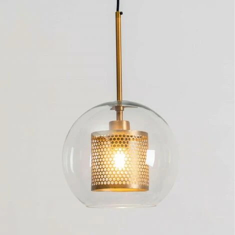 Laisser vous séduire par cette suspension Carina une chaleureuse suspension design en verre de 25 cm de diamètre. L’intérieur de la coupole en verre est composée d’un cylindre à découpe grillagée. Elle accueille une ampoule de culot E27. Ce luminaire apportera une ambiance tendance et cosy à votre pièce. Descriptif technique du luminaire : Culot de l’ampoule : E27 | Ampoule : 1 x 60W | Indice de protection : IP20 | Tension : 220/230V 50/60Hz | Poids du luminaire : 2,5 kg | Poids du colis : 3 kg | Couleur du produit : Doré / Laiton | Matière : Métal et Verre | Longueur : | Largeur : | Hauteur : | Diamètre : 25 cm | Profondeur :