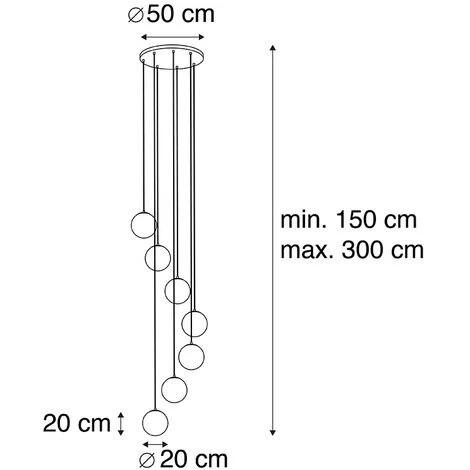 Pallon est réglable en hauteur. Minimum 150 cm et maximum 300 cm. La plaque de montage du plafond a un diamètre de 50 cm. Les boules en verre ont chacune un diamètre de 20 cm.