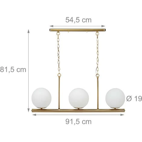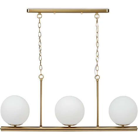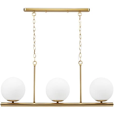 Vous aimez créer une ambiance chaleureuse dans votre intérieur, alors ce luminaire de plafond est ce qu’il vous faut. Cette lampe à suspension à 3 boules en verre opale assure un éclairage plutôt discret et doux de votre salon ou votre salle à manger. Grâce à son fini doré et ses chaînes à reflets elle est plus qu’une simple lampe à boules. Pendant la journée également elle fait fonction d’élément moderne de décoration.