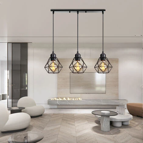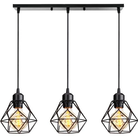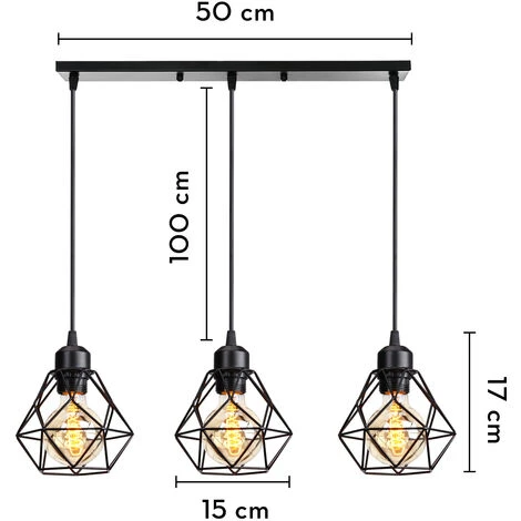 Dimension de cage: 15x15x16cm, Dimension de base barre: 50*5cm. Longeur de corde:100cm ajustable, Tension: 220-240V, Puissance: max 60W, Douilles de lampe: 3x E27, Ampoules existantes: ampoule LED / ampoule edison / ampe à économie d’énergie / halogène. Remarque: L’ampoule n’est pas incluse.