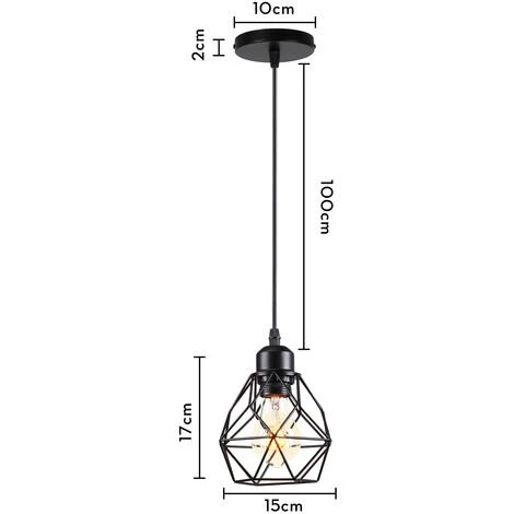 Dimension de cage: 15x15x16cm, Diamètre de base:10cm. Longeur de corde:100cm ajustable, Tension: 220-240V, Puissance: max 60W, Douilles de lampe: 1x E27, Ampoules existantes: ampoule LED / ampoule edison / ampe à économie d’énergie / halogène. Remarque: L’ampoule n’est pas incluse.