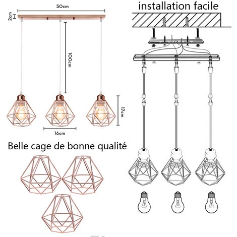 Dimensions cage (L x l x h):16x16x18cm, dimension de base barre : 50cm*5cm Longeur de corde:100cm ajustable,vous pouvez couper le câble selon vos besoins lorsque vous installez la lustre.