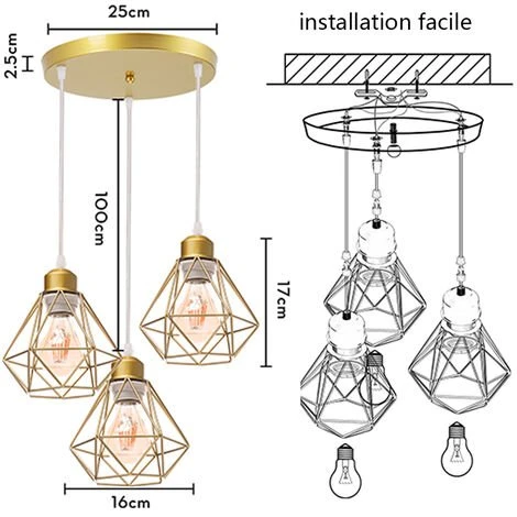 Dimensions cage (L x l x h):16x16x18cm, diamètre de base rond: 30cm. Longeur de corde:100cm ajustable,vous pouvez couper le câble selon vos besoins lorsque vous installez la lustre.