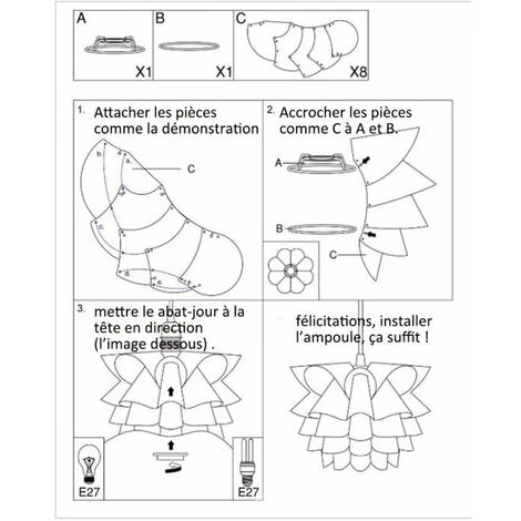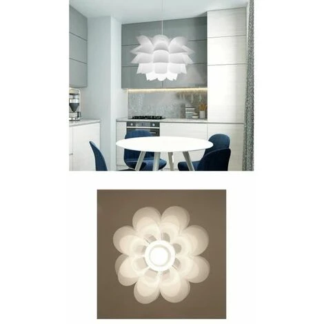 Compris: 1 x lustre la forme du lotus assemblé(36*28cm) + La base et fil suspendu(1.2m réglable). Fonctionnalité – Couleur de l’abat-jour: Blanc. – Matériau: PVC. – Taille: 36cm (diamètre), 28cm (hauteur) – Zone d’éclairage: 8-10 mètres carrés. – Source d’éclairage: ampoule E27. Les ampoules ne sont pas incluses et ce lustre doit être assemblé par vous-même. Facilement assemblable en référence de la démonstration, sans colle ni outil. Il suffit de s’enfiler les uns dans les autres pour former un bel abat-jour suspendu. Peut être nettoyé avec un plumeau ou en utilisant la pomme de douche dans la douche.